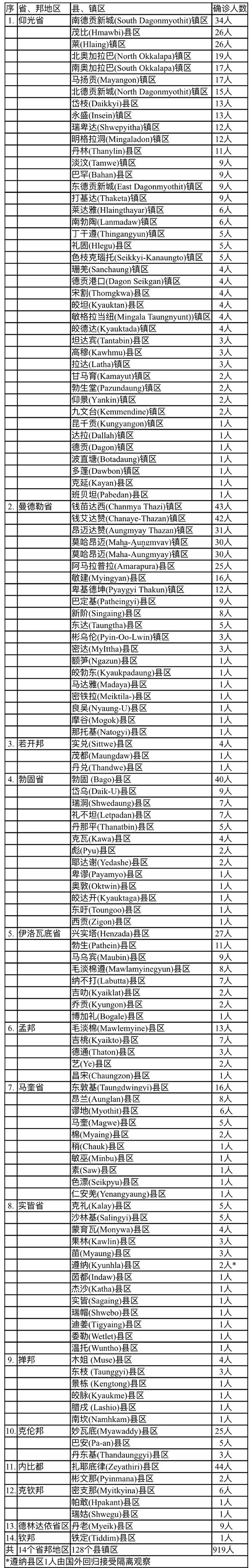 缅甸卫生暨体育部12月25日下午5时发出公告,通告12月24日这一天发现的919名确诊者的一些情况。这919名确诊者来自14个省邦地区,他们所属的县镇地区如下:
