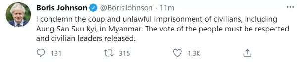 当地时间1日,约翰逊在推特上写道:“我谴责缅甸政变,以及非法监禁包括昂山素季在内的平民。人民的投票权必须得到尊重,民选领袖必须获释。”