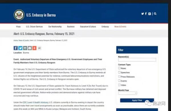 这是美国政客一贯使用的伎俩,乘缅甸的形势故弄玄虚,让人产生错觉,缅甸似乎将要爆发什么危急状态!(前几天不是有示威者打出欢迎美国军队的标语吗?)只要你仔细一读就能理解美国外交部说的是允许其公民回国,至于美国公民可能会遇到暴力,只要自己不出住所,哪来的暴力?只要你到示威场所,任何人都可能会遇到不测的风险,这是众人皆知的。有关通讯受到阻碍,那也是缅方有关当局为了防止示威蔓延扩散,根据所需采取的行动,只是暂时而已,这是住在缅甸的人都能理解的事;目前缅甸的国际航班数量有限,那也是为了防控疫情,前民盟政府时期就已经限制国际航班的降落,并非是最近才有的事!