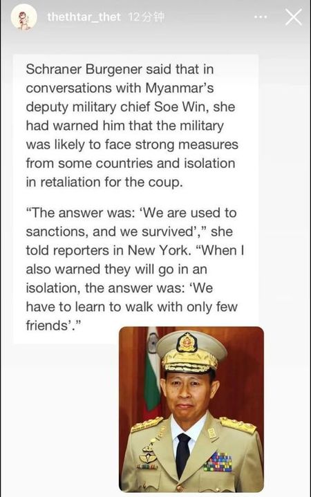 NEWS ELEVEN 报道。3月3日联合国缅甸特使克里斯丁.霞仁娜.巴基纳与缅甸军方二把手副总司令梭温副大将以视频会议方式再次会晤。联合国缅甸特使透露,当日缅甸示威群众有38名身亡,这是自缅甸政变以来流血人数最多的一天。当联合国缅甸特使对军方警告国际社会对此会实施制裁行动缅甸将面临孤立时,副总司令强硬回答:“对于制裁,我们已经习以为常!面对孤立,我们能够顶住!我们将学会与少数朋友继续前行!”看来缅甸军方是死心塌地一意孤行,不走回头路啰?