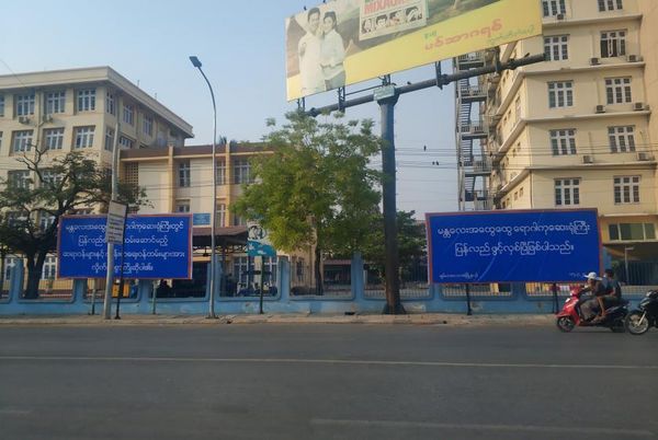 3月16日中午,警方在曼德勒市羌埃达善镇(Chanayetharsan)30条街曼德勒综合医院前,竖立了蓝色大幅标语:曼德勒综合医院将于3月17日重新开放,热烈欢迎重返单位的医护人员。