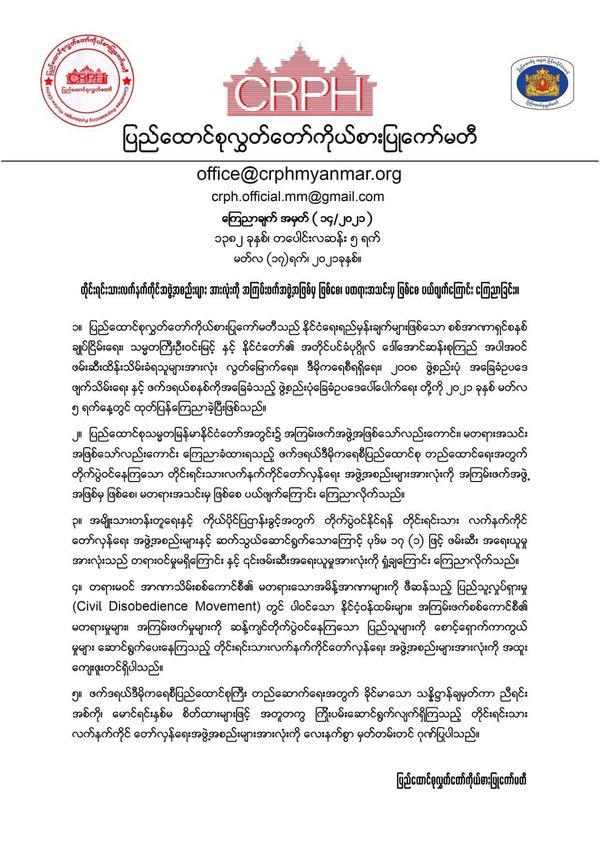 联邦议会代表委员会(Committee Representing Pyidaungsu Hluttaw (CRPH))宣布,所有民族武装部队都不再是恐怖组织或非法组织。完整的陈述如下: