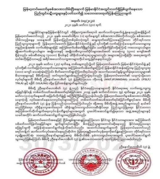 3月30日,缅甸民族正义党/缅甸民族民主同盟军(MNTJP/MNDAA)、崩龙邦解放战线/德昂民族解放军(PSLF/TNLA)、若开民族联盟/若开军(ULA/AA)等组成的“兄弟联军”联合发声,敦促军方立即停止对和平抗议者的暴力镇压,尽快解决政治分歧,维护国家稳定。