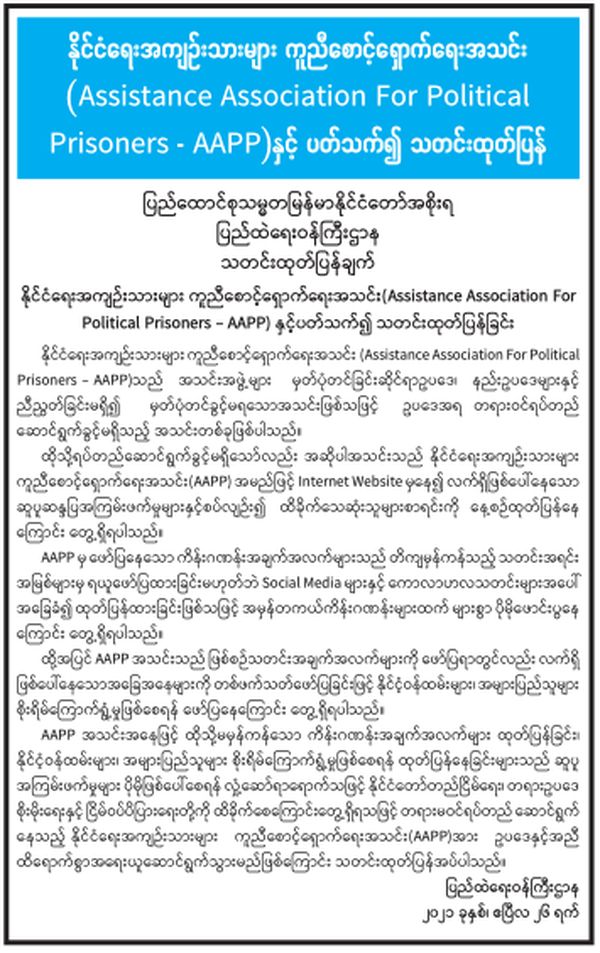 据4月27日出版的《缅甸之光》报报导,缅甸联邦内政部于2021年4月26日发出一则有关“政治犯协助协会”(Assistance Association for Political Prisoners-AAPP)组织的通告,声称该组织不是依法合情合理成立的一个组织。