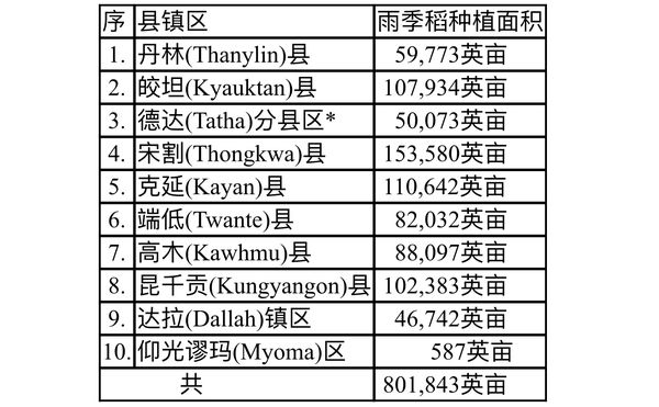 仰光省南部专区各县镇区计划种植的雨季稻面积如下: