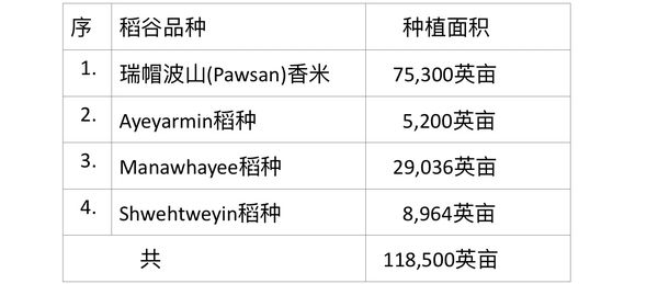 而种植的稻谷品种分别为:瑞帽波山(Pawsan)香米75,300英亩,Ayeyarmin稻种5,200英亩,Manawhayee稻种29,036英亩,Shwehtweyin稻种8,964英亩。而在去年,全县的雨季稻种植面积为105,991英亩。 这是由县农业局处获知的讯息。