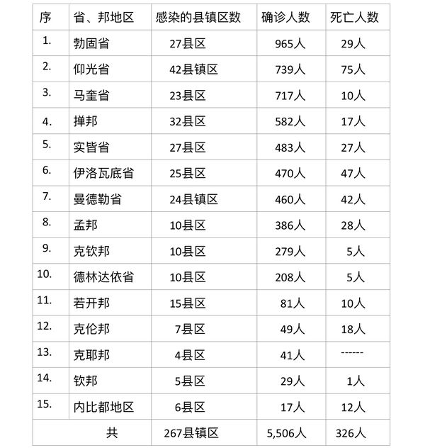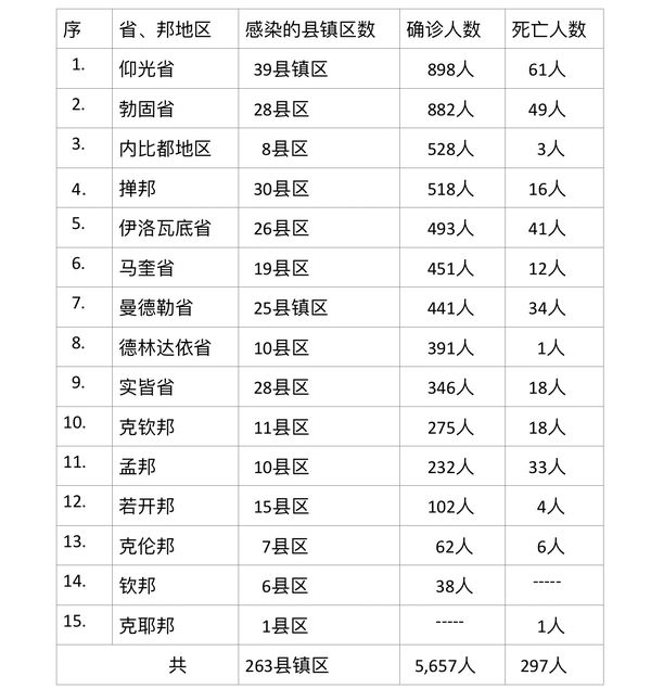 据缅甸卫体部7月24日晚上5时所发布的公告,公布全国各省邦7月23日的确诊人数及死亡人数,具体数据如下表: