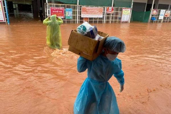 7月26日下午,克伦邦妙瓦底市第四小区的瑞妙瓦底检疫隔离中心因大雨被淹。