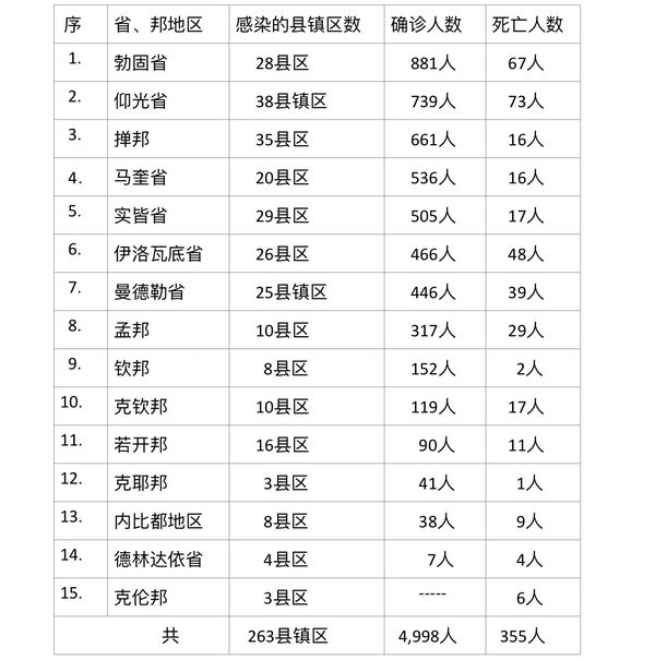 据缅甸卫体部7月26日晚上7时所发布的公告,全国各省邦7月25日的确诊人数及死亡人数,具体数据如下表: