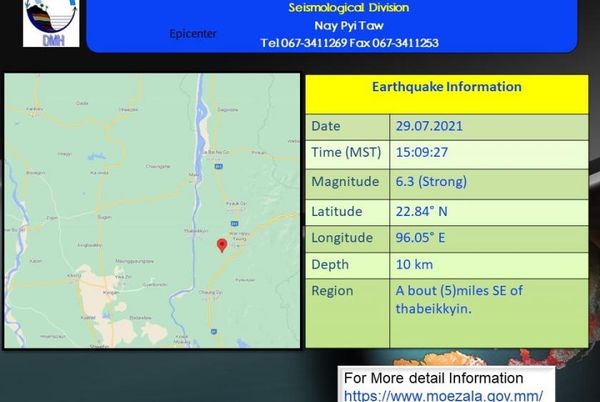 据气象与水文局的报导,7月29日下午3时9分,在曼德勒省德贝金市东南方向5英里处;北纬22.84度、东经96.05度处发生了深度为10公里氏6.3级地震。