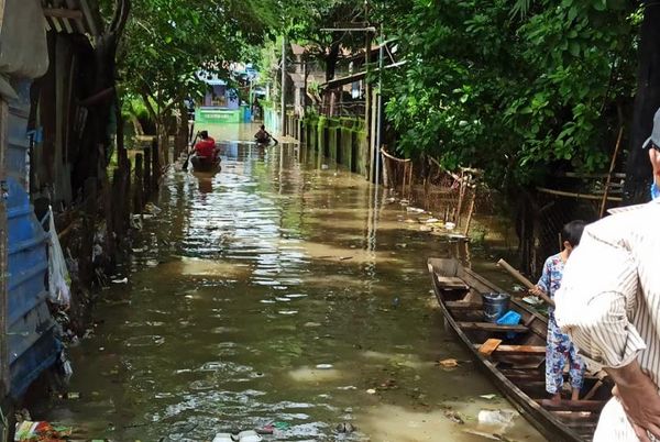 勃固河水位上升,导致勃固市低洼处小区内面临水灾。