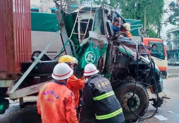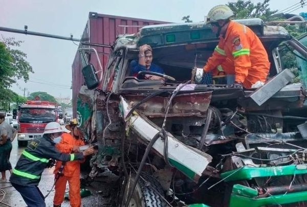 仰光省九文台镇一辆集装箱车与卡车相撞