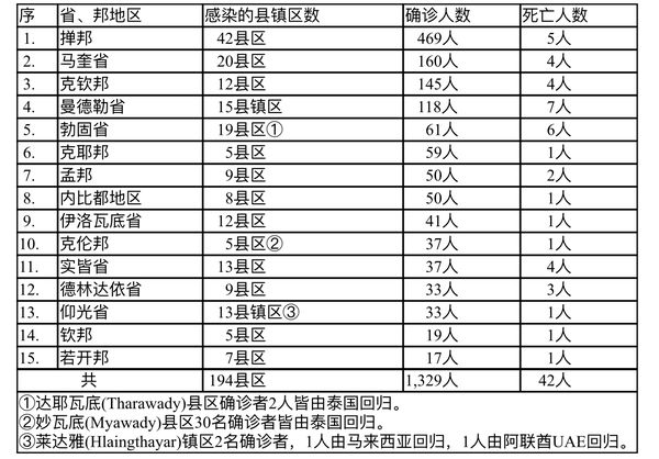 死亡人数方面,掸邦与曼德勒省蝉联第一(皆为7人),马奎省第二(6人)。其他省邦地 区死亡人数都是“屈指可数”了,其中德林达依省、勃固省、仰光省、伊洛瓦底省、钦邦及若开邦等为零死亡地区。
