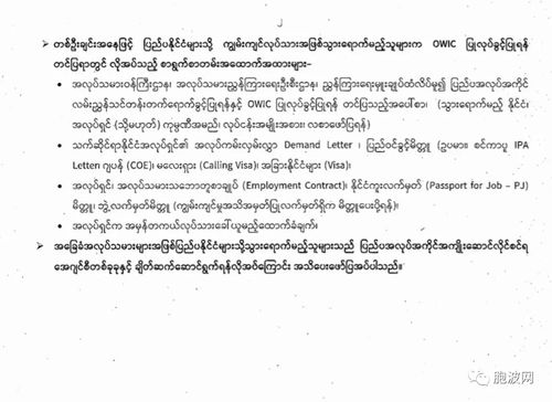 (二)申请海外劳工证OVERSEA WORKER MENTIFICATION CARD-OWMC须知。申请海外劳工证的组织或个人均必须持有以下证件:(1)申请海外劳工的公函(必须注明:外国公司、工作种类、月薪金额);(2)有关业主的DEMAND LETTER需求函、入境外国签证(如:新加坡(IPA LETTER)、日本(COF)、马来西亚(CALLING VISA)、其他国家签证);(3)业主劳工之间签署的劳动合同(EMPLOYMENT CONTRACT)、护照(PASSPORT JOB-PJ)的复印件;(4)业主招工的证明。申请者单位还必须有参加劳工培训班证明。