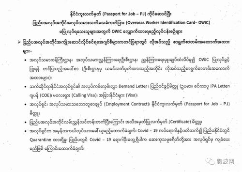 (一)《耶德纳蓬日报》报道。“欲出国打工者须持有海外劳工证明方能出国。”缅甸外劳服务协会副主席吴必达钮茂如是说。该海外劳工劳证由劳工部统一发放,有效期五年。因疫情停办的该外劳证发放工作,若有外劳需求,从十月份开始重新办理。“近期在社交网上发现很多欲出国打工者因没有海外劳工证无法出国。准备出国打工的人必须知道,除了必须有(劳工)护照,还需要有五年期限的海外劳工证。而且还必须参加过外劳培训班。这是属于正式出国打工的,缺少这些就无法出国。”吴必达钮茂继续介绍。
