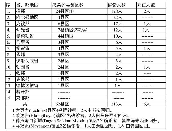 缅甸卫生部于12月25日下午4时发布公告,全国各省邦12月24日的确诊人数共为213人,死亡人数6人,具体数据如下表:
