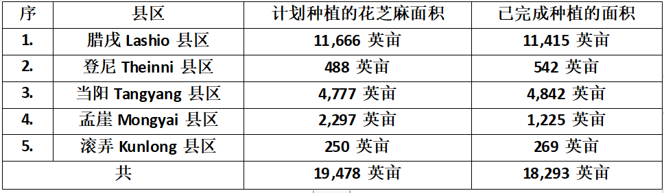 腊戌专区内的各县区计划种植的花芝麻面积及已完成的种植面积如下: