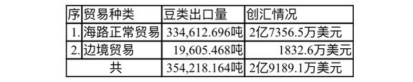 这期间向国外出口各种豆类,由海路贸易出口334,612.696吨,创汇2亿7356.5万美元;由边境贸易出口19,605.468吨,创汇1832.6万美元。所以这期间各种豆类出口达到354,218.164吨,创汇共达2亿9189.1万美元。