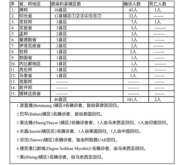 缅甸卫生部于1月17日下午4时发布公告,全国各省邦1月17日的确诊人数共为101人,死亡人数2人,具体数据如下表: