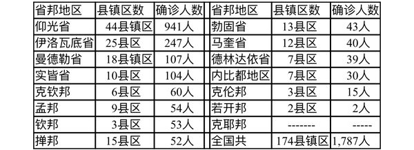 缅甸卫生部于2月13日下午5时发布公告,全国各省邦2月12日的确诊人数共为1787人,无死亡人数,具体数据如下表: