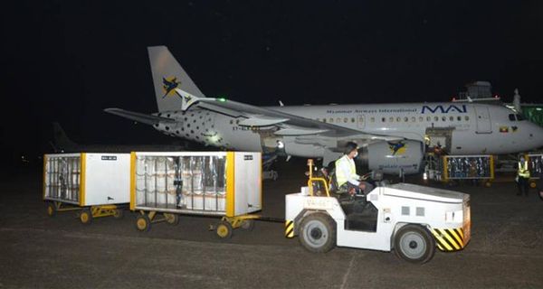 2月20日,印度军方捐赠的10万剂牛津-阿斯利康疫苗(COVISHIELD)搭乘缅甸国际航空(MAI)抵达缅甸仰光国际机场。