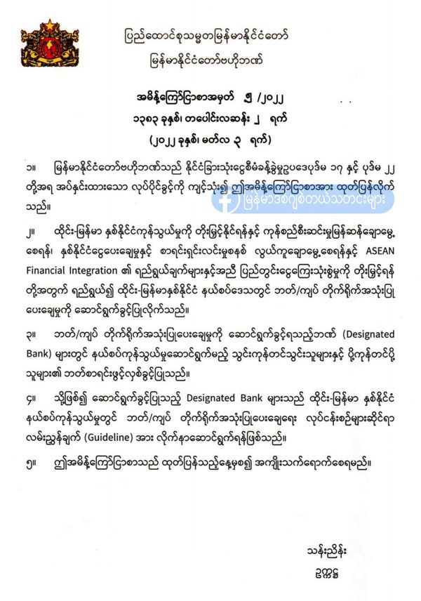 声明中表示,这些指定银行(Designated Bank)必须遵守在缅泰边境贸易中直接使用泰铢/缅币结算的相关规定。
