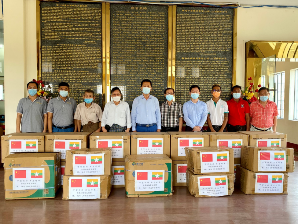 缅甸中华总商会向各社团分发由中国驻缅甸大使馆捐赠的口罩合影留念