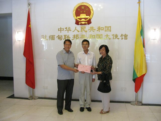 云南省鲁甸地区于8月3日发生强烈地震,造成617人遇难,一百参万人受灾,遭受巨大经济损失,消息传来,缅华各界极表关怀,于8月19日下午二时三十分,前往中国驻缅甸大使馆表示慰问,并捐赠赈款。杨厚兰大使一一接受了捐款,颁予奖状,并分别合影。