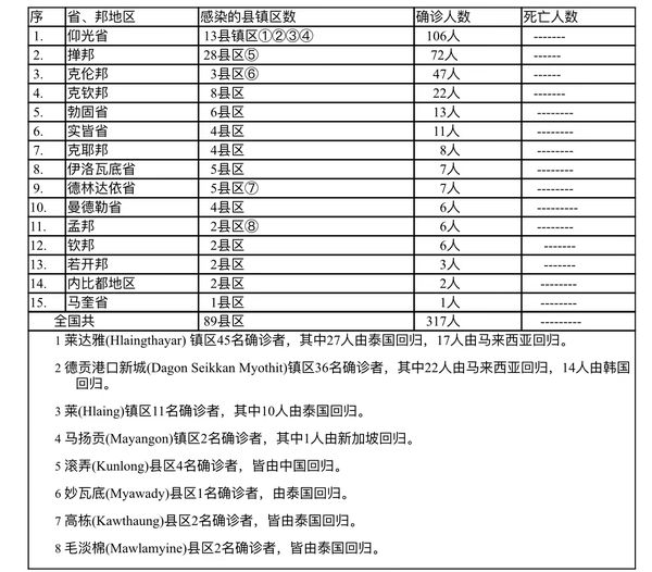缅甸卫生部于3月26日下午6时发布公告,全国各省邦,3月25日的确诊人数共为317人,无死亡人数,具体数据如下表: