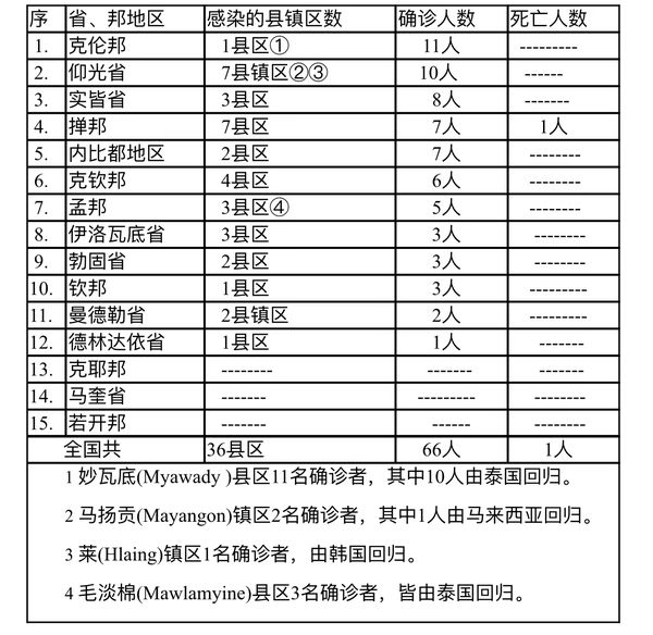 缅甸卫生部于4月4日下午6时发布公告,全国各省邦,4月3日的确诊人数共为66人,死亡人数1人,具体数据如下表: