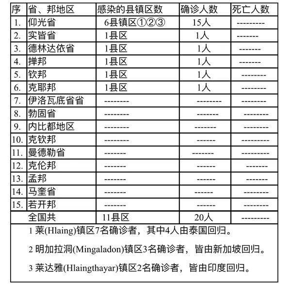 缅甸卫生部于4月18日下午4时发布公告,全国各省邦,4月17日的确诊人数共为20人,无死亡人数,具体数据如下表: