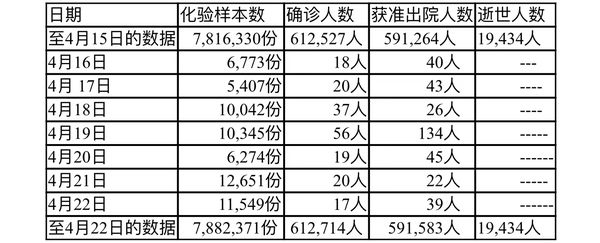 缅甸卫生部2022年4月16日至4月22日每晚8时时所公布的疫情情况分别如下: