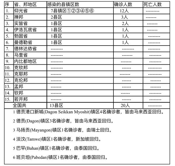 缅甸卫生部于4月22日下午4时发布公告,全国各省邦,4月21日的确诊人数共为20人,无死亡人数,具体数据如下表: