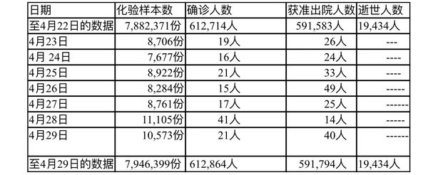 缅甸卫生部2022年4月23日至4月29日每晚8时时所公布的疫情情况分别如下: