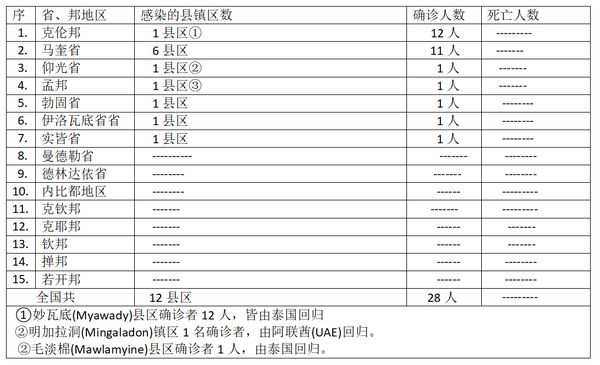 缅甸卫生部于5月14日下午4时发布公告,全国各省邦,5月13日的确诊人数共28人,无死亡人数,具体数据如下表: