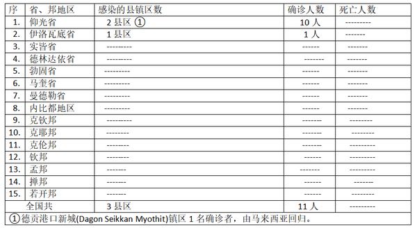 缅甸卫生部于5月31日下午4时发布公告,全国各省邦,5月30日的确诊人数共11人,无死亡人数,具体数据如下表: