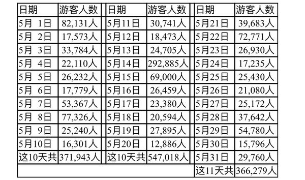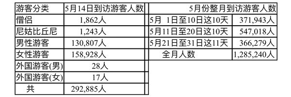 在这5月份内,朝拜者游客最多的天是5月14日——宋月盈日,这一天是佛教最重要的节日之一,是佛陀的诞辰日、悟道之日及涅槃(圆寂)之日。这天前来朝拜瞻仰的游客中,僧侣人士有1,862人,尼姑比丘尼1,243人,游客男性130,807人,女性158,928人,外国游客男性28人,女性17人,共为292,885人。