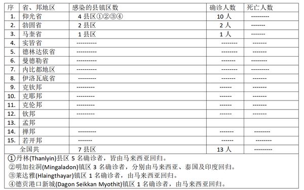 确诊者虽说是有13人,但只是来自三个省区,而且仰光省10名确诊者都是由国外回归者(其中8人由马来西亚回归),这个情况值得注意。