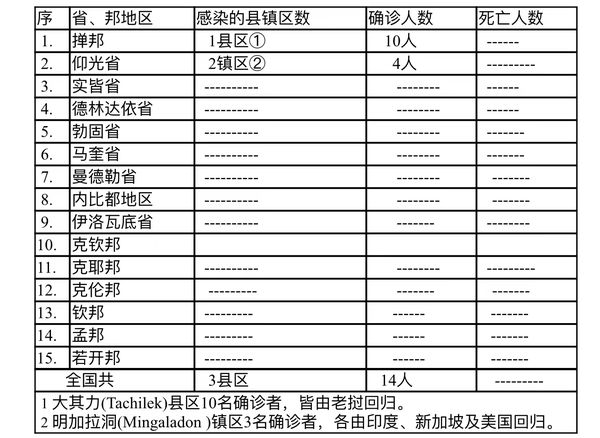 缅甸卫生部于6月22日下午4时发布公告,全国各省邦,6月21日的确诊人数14人,无死亡人数,具体数据如下表: