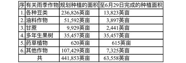 按:以上所规划的种植面积这一栏目中,各种作物的规划种植面积加起来只有441,853英亩,不符合所说的587,132英亩这是因为现在所列的各种作物中,缺少“粮食作物”这一项。甘布鲁县区原规划种植的粮食作物有24多万英亩(见《缅华网》6月7日“缅甸新闻”栏目中的有关报导)。