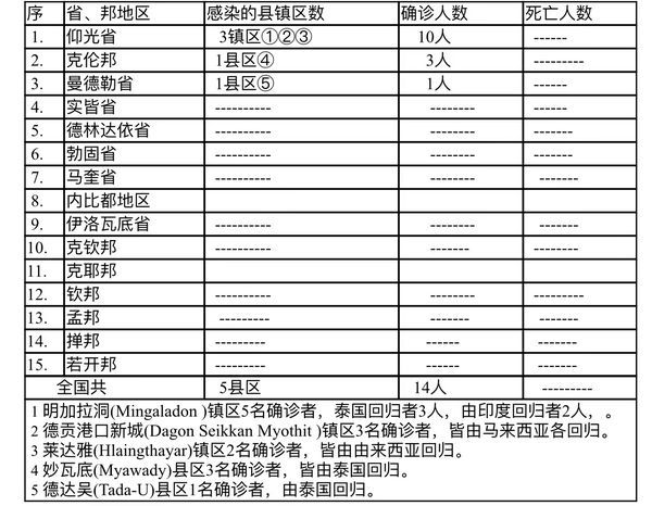 缅甸卫生部于7月3日下午4时发布公告,全国各省邦,7月2日的确诊人数14人,无死亡人数,具体数据如下表:
