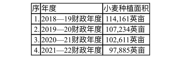 实皆省最近几年来小麦作物的种植情况:2018—19财政年度时种植了111,161英亩,2019—20财政年度时种植107,234英亩,2020—21财政年度种植102,611英亩,2021—22财政年度时种植的面积为97,855英亩。