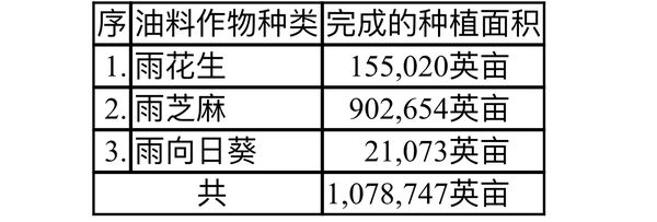 雨季油料作物在11个专区属下的各县区进行种植,雨花生、雨芝麻及雨向日葵等油料作物将共种植130多万英亩,从6月初就开始种植,到现在7月份第一周为止,共种植了雨花生155,020英亩,雨芝麻902,654英亩,雨向日葵21,073英亩,油料作物共完成的种植面积为1,078,747英亩。