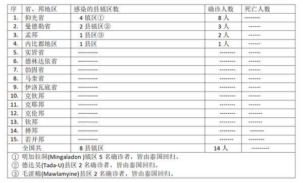 缅甸卫生部于7月27下午4时发布公告,全国各省邦,7月26日的确诊人数14人,无死亡人数,具体数据如下表: