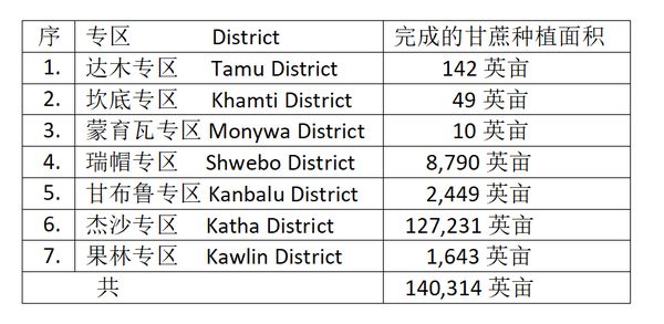 甘蔗种植最多的专区为杰沙专区,其次为瑞帽专区,第三为甘布鲁专区。杰沙专区的种植量所占比例最大,已完成的14万英亩种植面积中,杰沙专区就占12.7万英亩,比例达到90%以上。