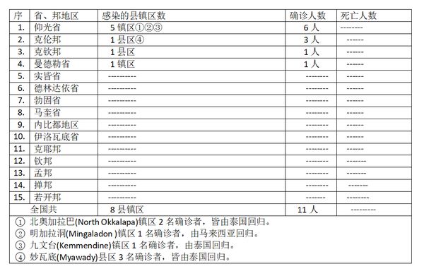 缅甸卫生部于7月28下午4时发布公告,全国各省邦,7月27日的确诊人数11人,无死亡人数,具体数据如下表: