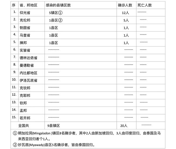 缅甸卫生部于8月7日下午4时发布公告,全国各省邦,8月6日的确诊人数20人,无死亡人数,具体数据如下表:
