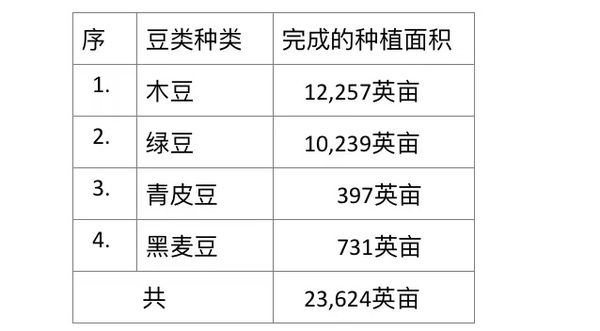而各种豆类完成种植工作的面积分别为:木豆12,257英亩,绿豆10,239英亩,青皮豆(Suntapya)为397英亩,黑麦豆为731英亩,共23,624英亩。