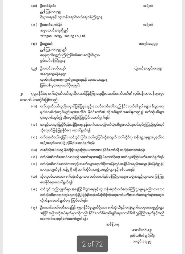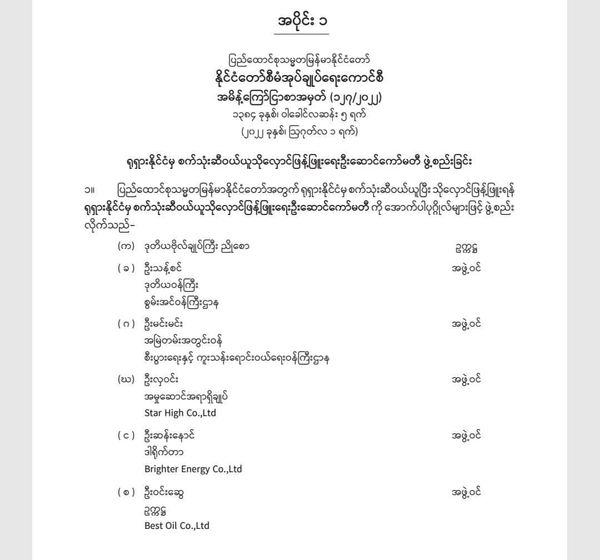 此外,能源署署长吴瑞莫(U Shwe Maw) 将担任该委员会秘书长,缅甸经济控股有限公司总经理吴茂茂觉(U Maung Maung Kyaw )将担任联席秘书长。