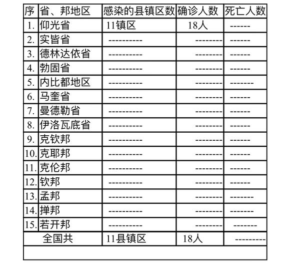 缅甸卫生部于8月16日下午4时发布公告,全国各省邦,8月15日的确诊人数18人,无死亡人数,具体数据如下表: